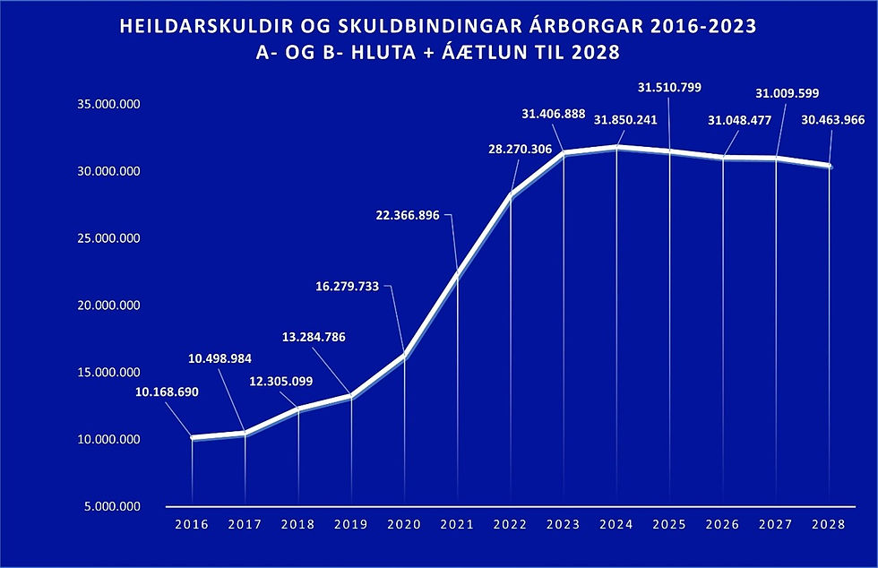 Mynd 1: Heildarskuldir og skuldbindingar Árborgar ásamt áætlun 2025-2028